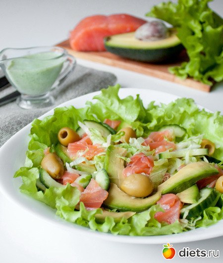 Сверху кладем авокадо, огурец, рыбу и оливки.