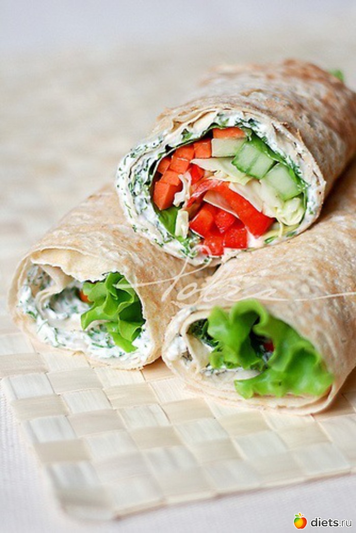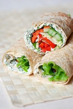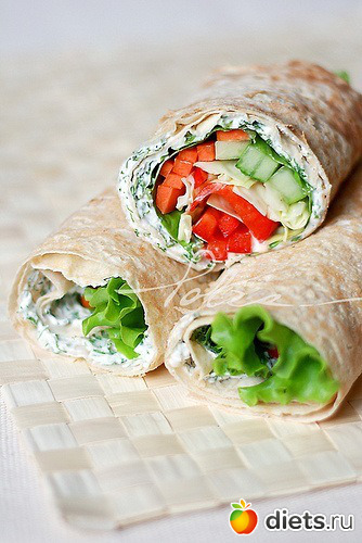 - Смазываем творогом с зеленью 2/3 кусочка лаваша, прокладываем листом салата, укладываем овощи и сворачиваем в рулет, чтобы ненамазанный "хвостик" оборачивал рулет последним