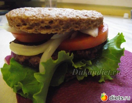 соль, перец. Приготовить диетический хлеб в круглой формочке (кружечке, салатнике). Разрезать вдоль напополам. На нижнюю половинку положить салатные листья. Взять кусочек фарша (в фарш ничего не добавляем, не солим, не перчим) скатать шарик и расплющить в тоненькую котлетку (толщиной не более 0,5 см). Обжарить на гриль сковороде по 1 мин. на каждой стороне (главное не пережарить, а то будет сухо). Когда переворачиваем котлетку, верхнюю обжаренную сторону солим и перчим, снимаем и укладываем ее на «булочку» с салатными листьями, посоленной стороной вниз. Солим и перчим другую сторону. Сверху кладем кружочек помидора, лук и накрываем второй половинкой «булочки».