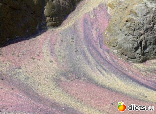 Более уникальным считается пляж Pfeiffer Beach в Калифорнии. Он, по праву, носит название самого разноцветного пляжа в мире. В прибрежных холмах, окружающих бухту Big Sur, содержится огромное количество частиц красного граната. Но, так как почву с холмов дожди смывают неравномерно, то ее оттенки всегда изменчивы, и песок на пляже становится многочисленных оттенков - от розового до ярко-пурпурного.