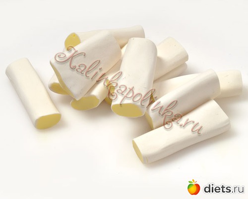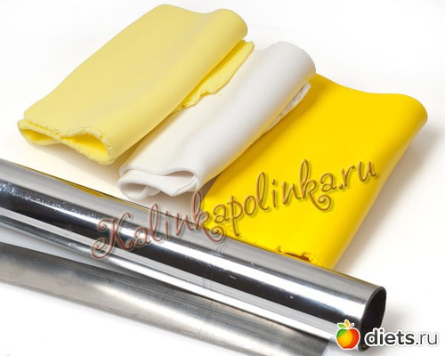 Складываем половинки вместе, в уголки, между дольками ставим трубочки белого цвета тонкие. Оборачиваем всю колбасу сначала белым цветом, а потом желтым.