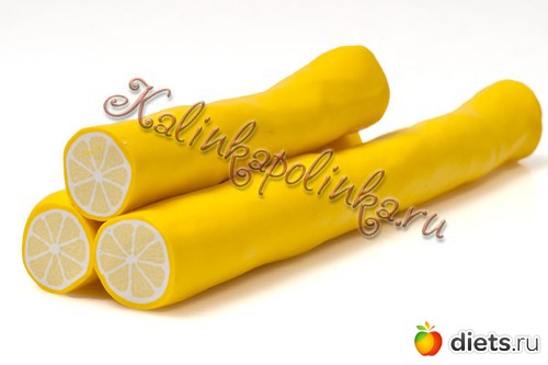 Ужимаем, разрезаем на 12-15 частей. Зависит от того, насколько большой Вы хотите сделать лимон. Чем больше колбасу в итоге Вы хотите использовать, тем больше деталек нужно делать. Если же Ваша итоговая цель- маленькая колбаска, маленькие бусинки, то даже меньше можно делать, потому как на совсем маленьком узоров не будет видно.