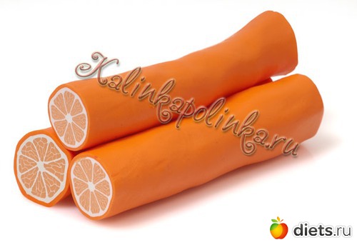 Если использовать вместо желтого цвета оранжевый, то получится апельсин. На фотографии виден небольшой дефект, который случается, если взять один цвет более твердый, чем другой. На той колбаске, что покрупнее явно видно, что белый цвет слишком твердый (еще это видно в нашем мастер-классе с яблочком, там твердоват зеленый, яблочко получилось немного угловатое из-за этого). На маленьком апельсине это будет почти не заметно, но в любом случае лучше это учитывать в работе: используйте пластику одинаковой мягкости.
