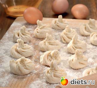 Разложить на них начинку, сверху положить кусочки сливочного масла. Слепить края теста, закрутив их спиралью. Готовить манты на паровой бане 20–25 мин., до мягкости.