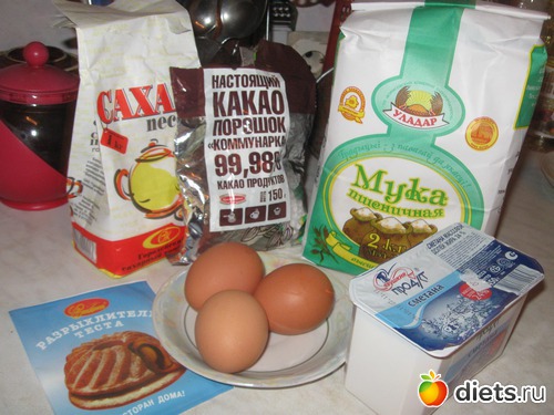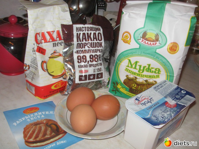 добавить сметану, какао, муку и разрыхлитель и хорошо взбить венчиком
