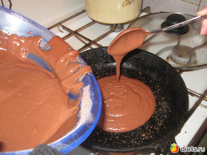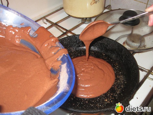 на форму смазанную маслом и посыпанную сухараями (у меня блинная чугунная сковородка) выложить 4 ложки теста