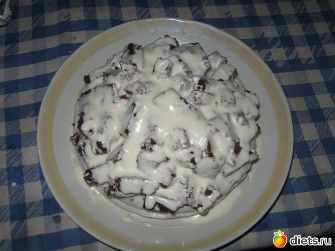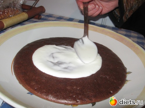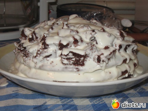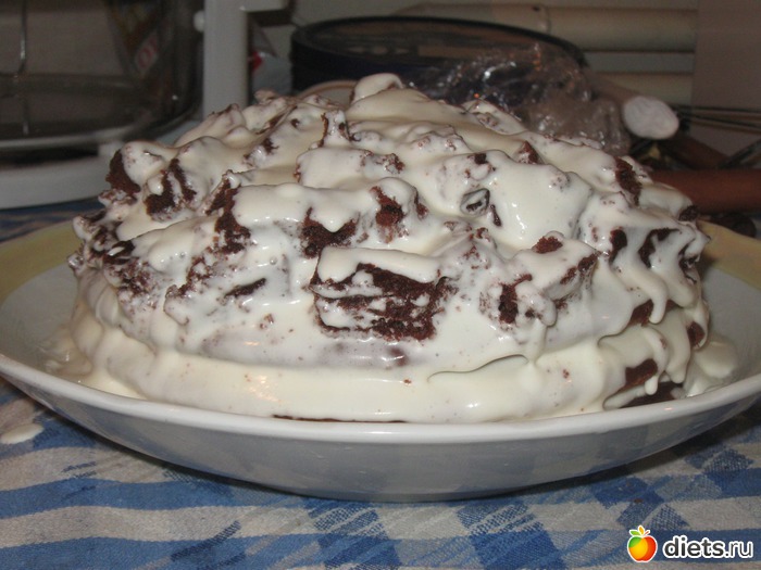 получается 4 коржа, последний ломаем кусочкамми, макаем в крем и выкладываем сверху горкой