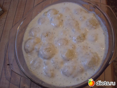 Все заливаем соусом, в данном случае это активия кефирная 1% с адыгейской солью и несколько зубчиков чеснока.