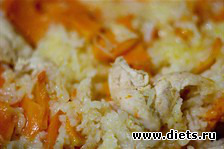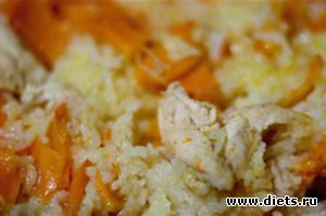 Чашка риса промывается и отправляется на некоторое время обжариваться вместе с овощами и мясом. Немного соли и добавляем в 3и раза больше воды чем объем риса, или 2е, если нужен рис более сухой.