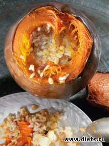 Запекайте примерно сорок минут. При подаче выкладывайте плов на тарелки, захватывая ложкой тыквенную мякоть.