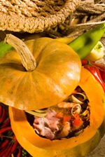 В очищенную от внутренностей тыкву переложите тушенное мясо с овощами и накройте шляпкой.
