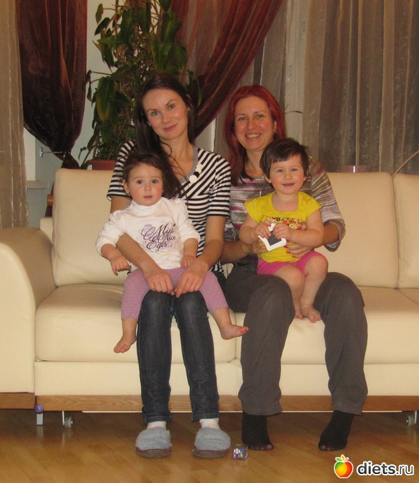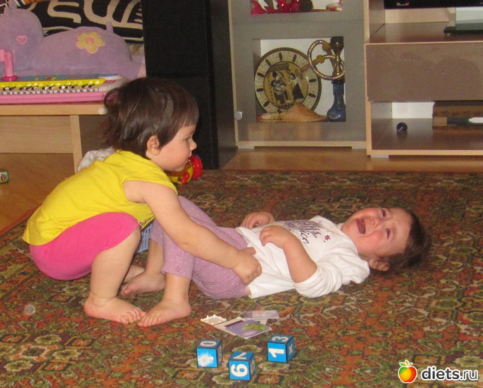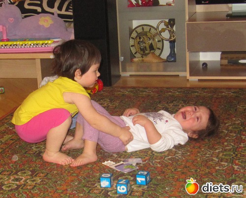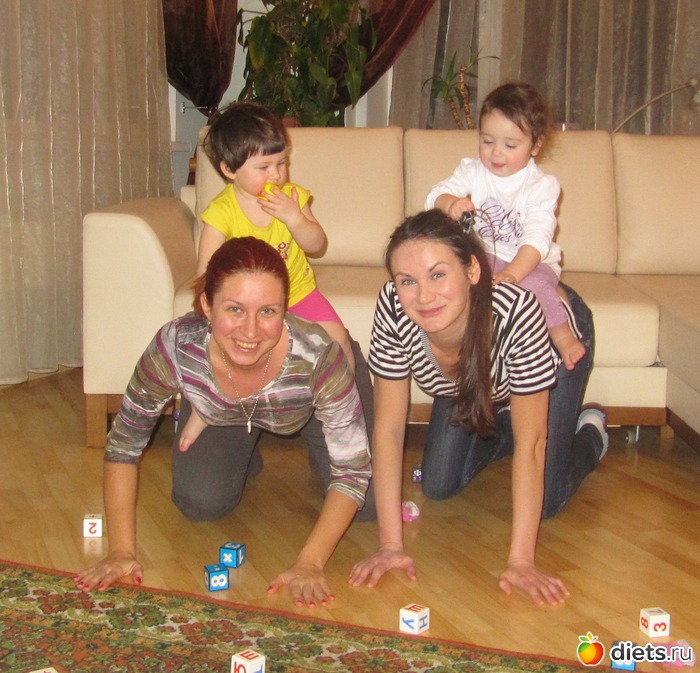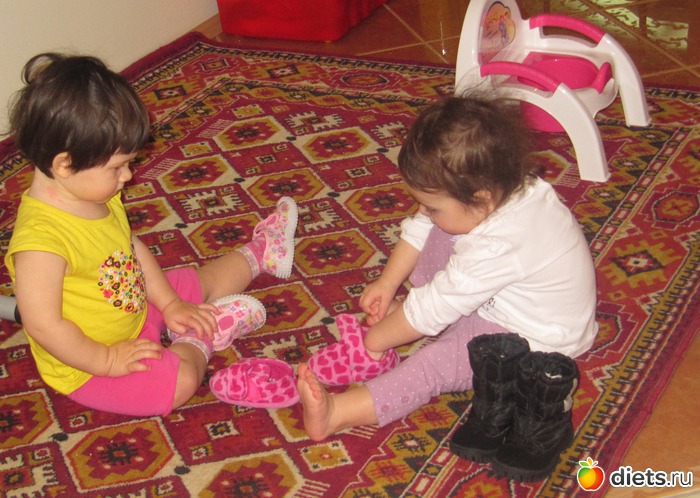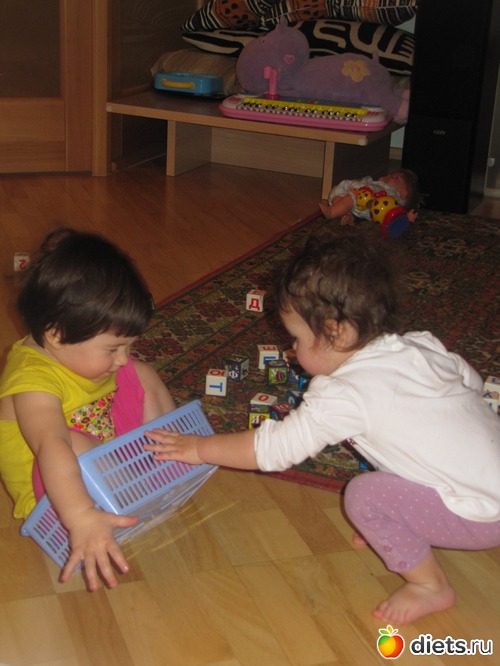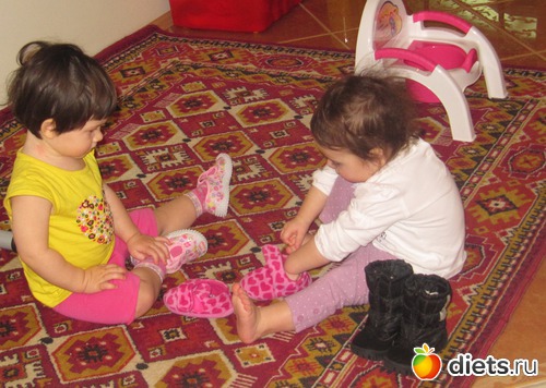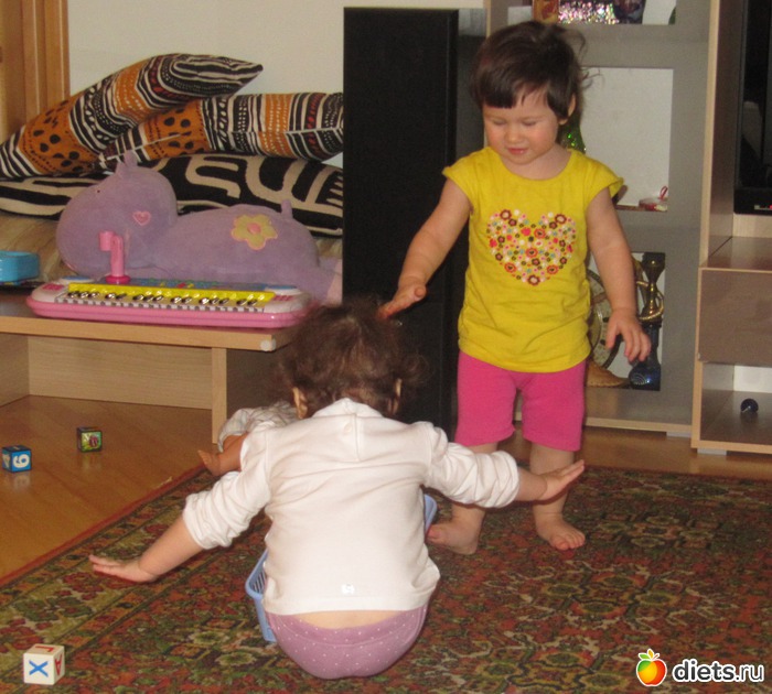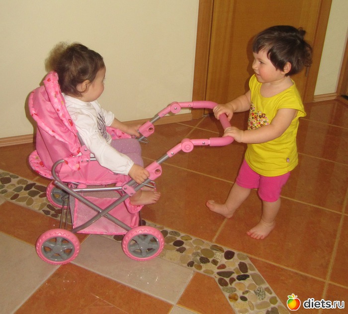 Дома наши дамы переобулись (и вообще привели себя в порядок), покушали и потихоньку распространяли игрушки по всей площади квартиры, разобрали диван, роняли друг друга, кто-то плакал, кто-то нет, успокаивали друг друга, целовали в щечку, катали на коляске, катались на мамах, все были довольны и счастливы.