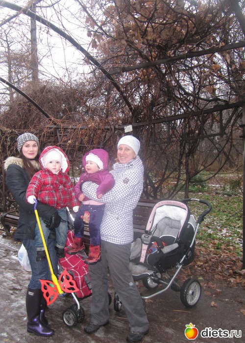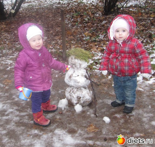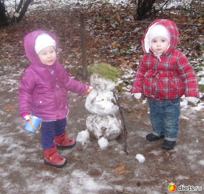 Немножко побыли дома и пошли гулять в БотСад МГУ - Аптекарский огород. Там пытались ломать снеговика (был спасен), носились по дорожкам, кормили птичек, гоняли голубей, познакомились с двумя мальчиками (общение было недолгим, женихов увели конкурентки - мамы), падали попами, коленками и руками в снежно-ледяную кашу, промокли, собрались домой...