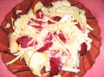 Капусту мелко порубить, яблоко и свеклу нарезать тонкими дольками, лук нарезать полукольцами и взбрызнуть уксусом. Все выкладываем на тарелку произвольно.