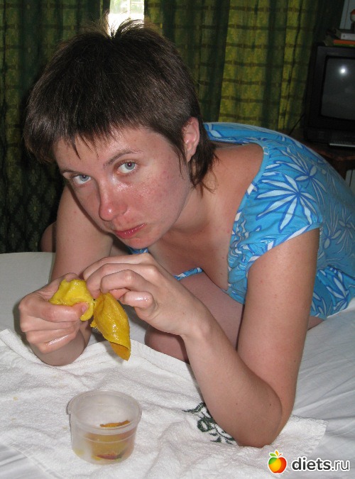 Катя впервые ест манго, очевидно думает, что никому не даст))))
