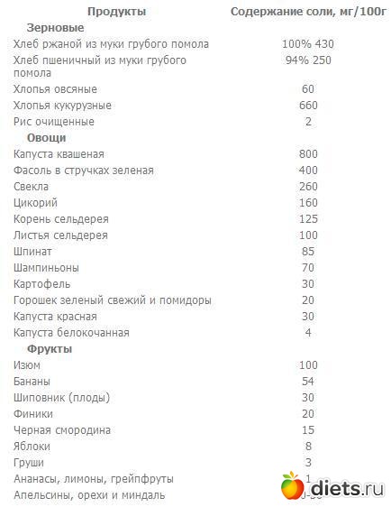 Содержание соли (натрия) в продуктах питания (по данным немецких ученых)