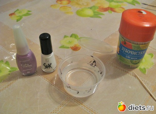 Итак, понадобится примерно минут 40 свободного времени, 2-3 контрастных лака, немного скотча, зубочистки и ёмкость с водой.