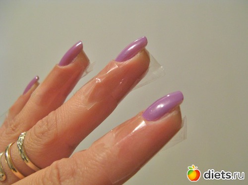 Сначала подготовим ногти. Для насыщенного цвета нужно накрасить их основным цветом, подсушить и обмотать палец скотчем вокруг ногтя, чтоб палец меньше пачкался:
