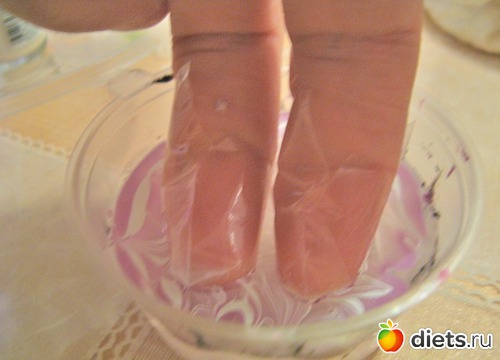Теперь аккуратно погрузим наши ноготки в ёмкость, а излишки лака на поверхности уберём зубочисткой.