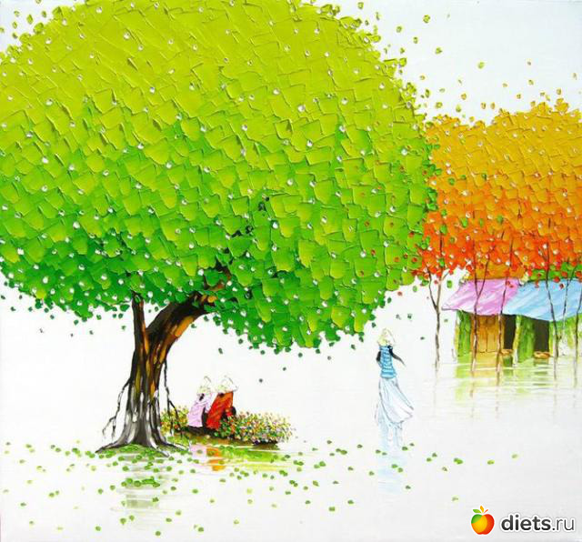 Работы вьетнамского художника Phan Thu Trang очень яркие и потрясающие, многим зрителям вначале кажется, что эти сказочные пейзажи сделаны просто из наклеенных разноцветных стикеров, которые художник просто-напросто наклеил на холст. Но при тщательном просмотре уже становится понятно, что это "холст, масло и мастихин". Для создания таких сказочных пейзажей художник берет небольшой нож-лопаточку (мастихин) и накладывает на холст краску.