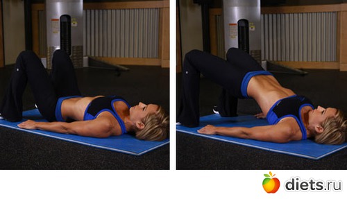 Из положения лежа поднимаем бедра вверх (плечи прижаты к полу)