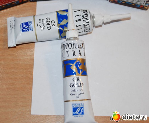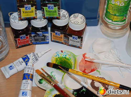 Я использую Vitrail - витражные краски (прозрачные), в палитре 18 цветов, сольвентовая основа гарантирует получение «гладкой» поверхности. Термообработки краски не требуют, сохнут в течение 12 часов. Краски декоративные, обработанную поверхность мыть можно, но осторожно (в ручную влажной тряпочкой).