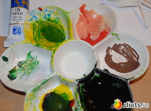 Для получения приятного глянца, без разводов кисточки, баночку с краской лучше держать поблизости. Кисточкой набираем нужное количество краски (в зависимости от участка, которым мы собираемся раскрашивать), краску желательно разводить кистью в одном направлении.