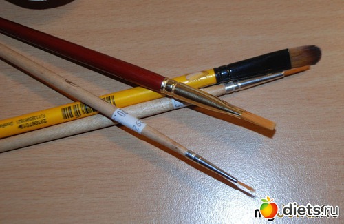 - Кисти (я использую синтетические, размер кисти по выбору, самое главное, что бы с неё было удобно работать) и тряпочка для излишков краски (после ополаскивания кисти от краски в разбавителе, вытираем кисть тряпочкой, а потом набирать краску снова)