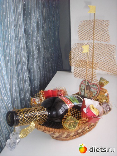 Привет, девочки! Ломая голову о новогодних подарках близким, в инете нашла массу интересных идей по их оформлению. Вот что получилось.Ёлочка ещё не совсем готова(осталось повесить маленькие конфетки-игрушки).Основа елки-жестяная коробка из-под чая, набитая конфетами и обтянутая декоративной бумагой. Каркас ёлки-проволока, обернутая мишурой.А корабль-ликёр и конфеты Читать полностью