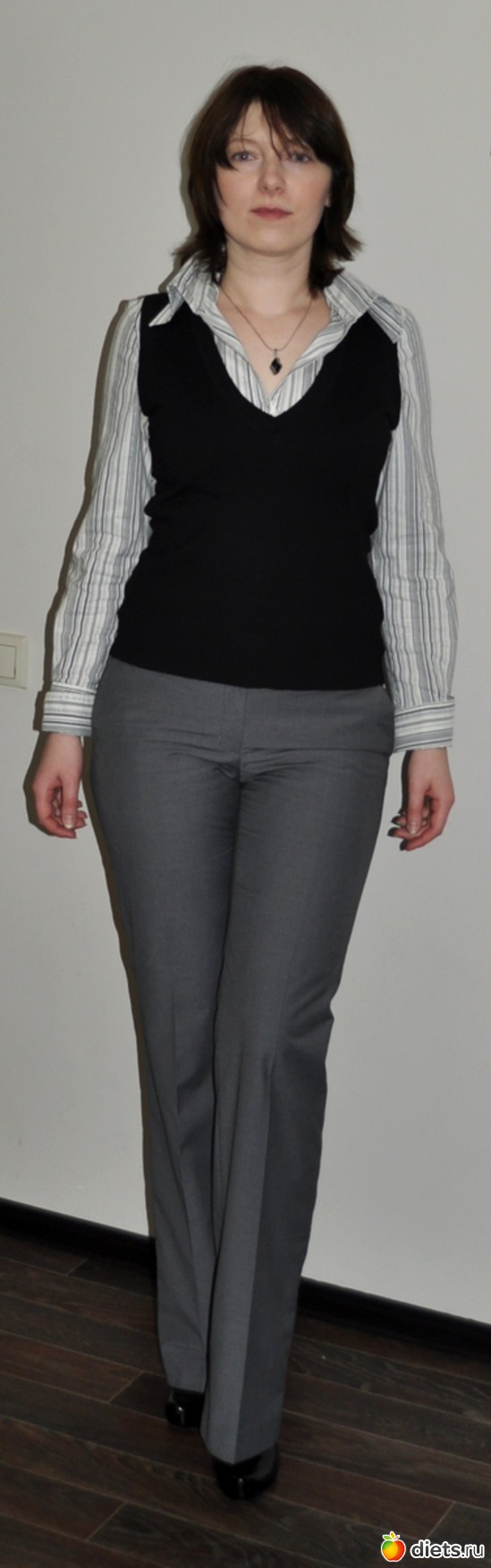 офисный стиль, брюки придают ногам более стройный вид, жилетка дополняет картину и помогает скрыть все недостатки фигуры