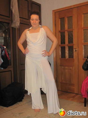 вечерний вариант, подобный костюм настоящая находка для яблок, так как скрывает живот и зрительно увеличивает грудь, при это белые перья на брюках прикрывают не ровности кожи