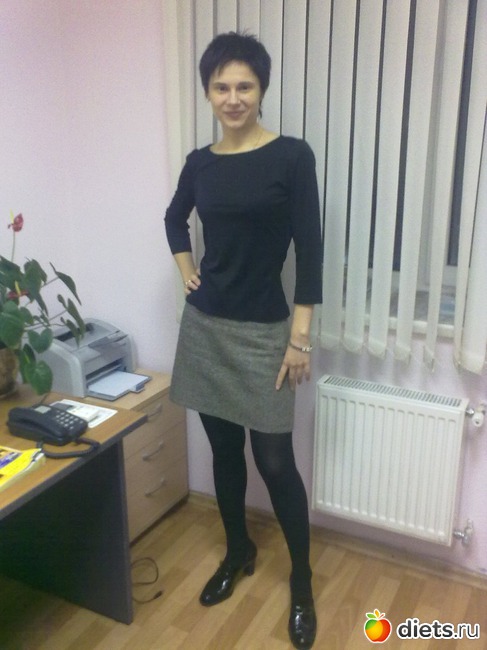 Светлый верх освежает, темные рукава делают руки более стройными. Темная юбка зрительно уменьшает бедра. Этот наряд хорошо балансирует фигуру.