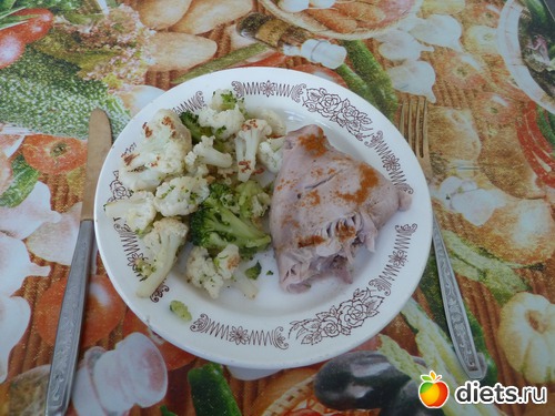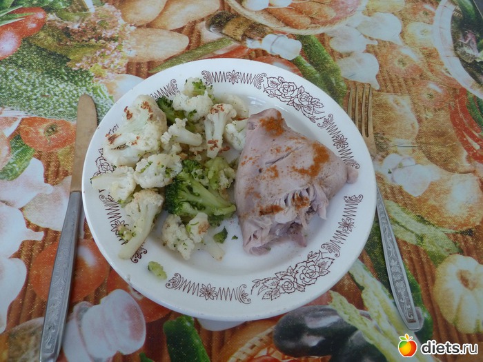 На обед я сварила окорочок без шкурки, на гарнир брокколи и цветная капуста, сначала я их приготовила в пароварке, затем запекла в духовке под сыром без масла, м-м-м вкусняшка