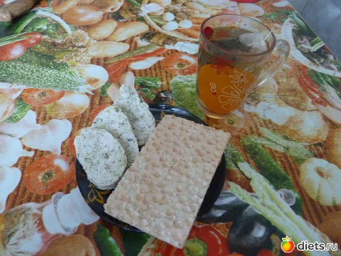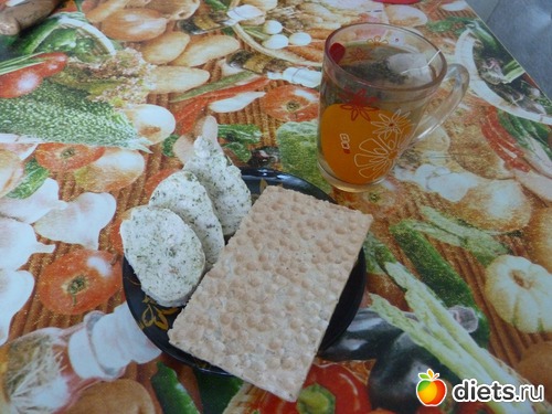Перекус: колбаска собственного приготовления, хлебец и зеленый чай