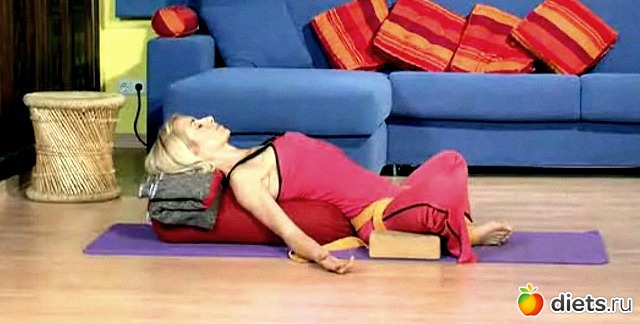 Лягте на пол, правую руку положите перпендикулярно телу, левой ногой попытайтесь дотянуться до руки, не сгибая руки и ноги, упражнения повторите по 3 раза для каждой стороны.