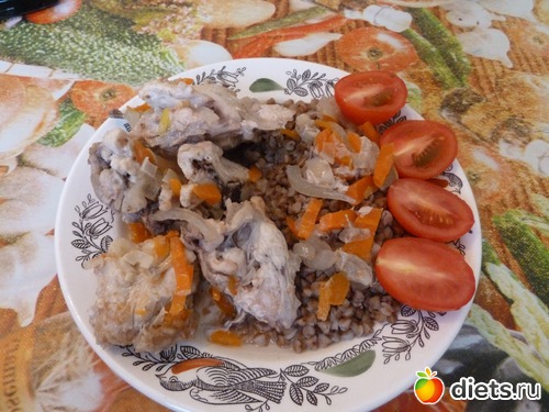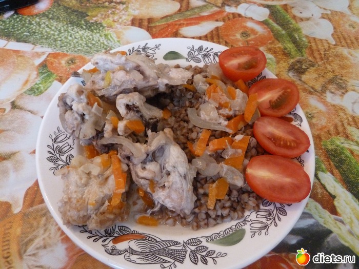 Обед: Куриная грудка с луком морковью и чесноком в пароварке, греча тоже из пароварки