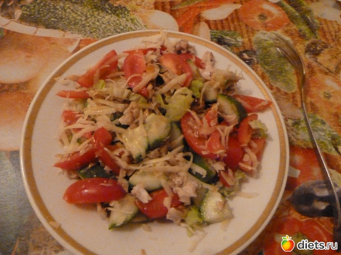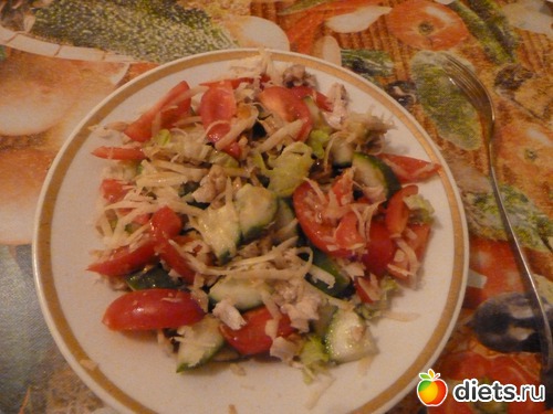 На ужин я себе приготовила салат: листья салата, помидоры черри, огурчик, вареная грудка и домашний сыр; заправка 1ч. л. раст. масла, 1ч. л. соевого соуса, и немножко горчицы, вкусняшка!!!