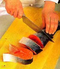 - Рыбу хорошо промыть под холодной водой, просушить бумажным полотенцем и разрезать на 4 кусочка (стейка) одинаковые по толщине (фото1).