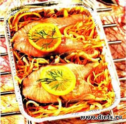 - Лук и морковь разложить в формы, заполнив пустое место вокруг рыбных кусочков (фото4)