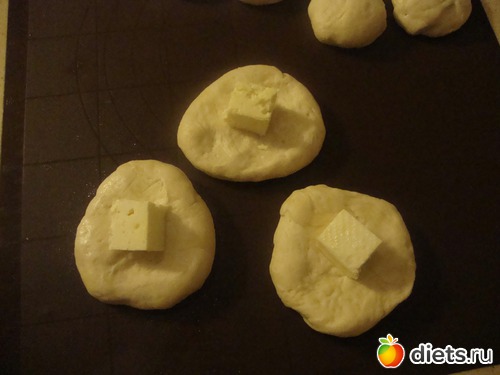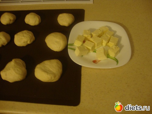 В каждый шарик уложить кубик брынзы. У меня в использование пошли кубики со стороной 1,5см. Сформировать шарики и уложить их в форму.