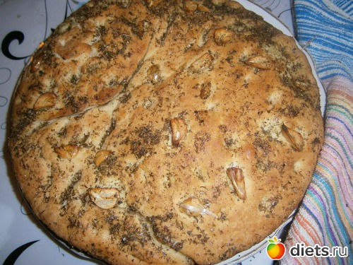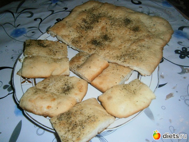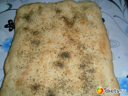 Фокачча я испекла первый раз по рецепту Малышки. Получилась она у меня с необыкновенным привкусом чеснока и с замечательным запахом прованских трав. Выглядела она вот так: