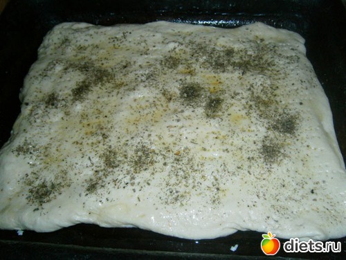 Изначально я хотела приготовить круглую лепешку, но посмотрев на объем теста я поняла, что фокачча у меня будет прямоугольная - по размеру противня.