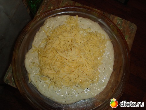 Тесто я разделила на 2 части, меньшую растянула руками смазанными оливковым маслом, выложила на смазанную форму, так же тесто смазала оливковым маслом (чтобы не было ощущения "непропеченности" начинки), чуть-чуть посыпала смесью трав, высыпала сыр.