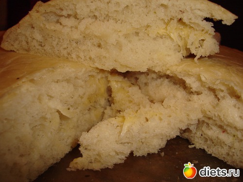 Поскольку выкладывая тесто я старалась не разрушить пузырики, то фокачча получилась вот с таким пузыречком с одного бока