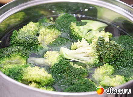 Брокколи вымыть, разделить на соцветия и положить в кипящую воду. Варить 3 минуты. Снять с огня, откинуть на дуршлаг, обдать холодной водой