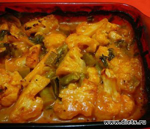 Ингредиенты на запеканку: 500 г цветной капусты, 200 г стручковой зеленой фасоли, 3 штуки моркови, 200 г зеленого горошка (можно консервированного), 3 яйца, 150 г молока, соль по вкусу, оливковое масло.