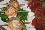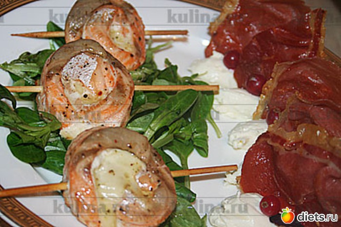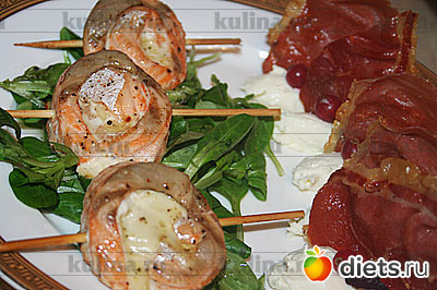 Свернуть каждый кусочек в рулет и закрепить с помощью зубочистки или шпажки.