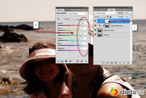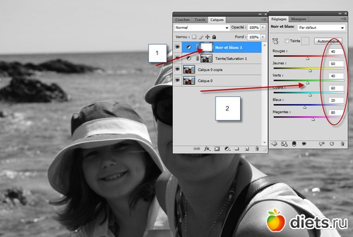 теперь перейдите через Меню> Layer> New Adjustment Layer> Черно-белый, чтоб появилась еще одна калька черно-белая (1) и в табло регулирующее цвет добавьте следующие параметры (2)