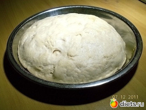 Смещать дрожжи с оставшейся водой и, частями просеивая муку, замесить тесто, добавив в конце соль и масло. Тщательно вымесить тесто в течение 10 минут.