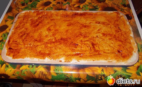 Полить двумя столовыми ложками масла, и распределить масло при помощи кисточки по всей площади теста.